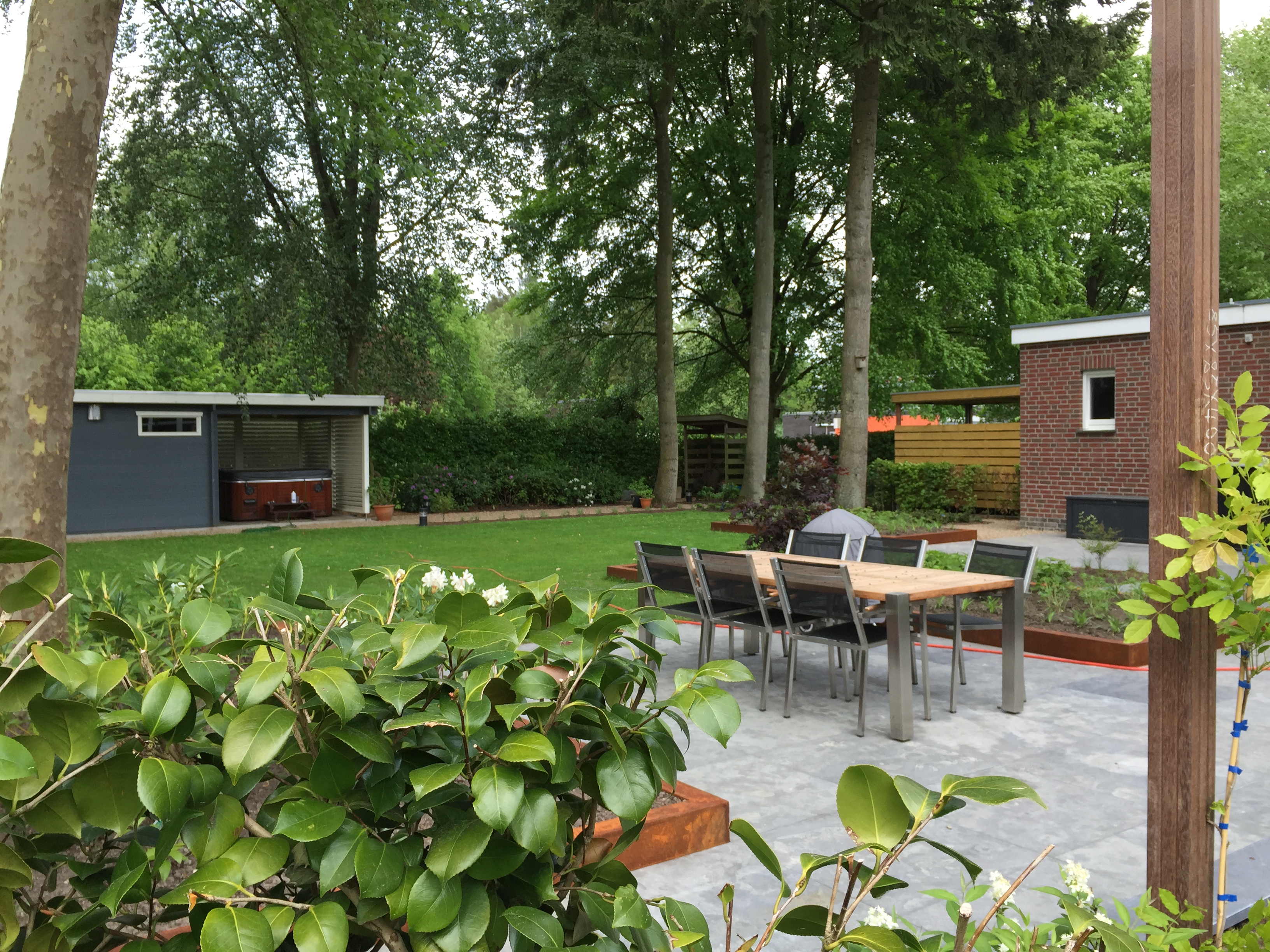 Een tuin met alles er op en eraan, beregening, verlichting, fietsenhok, bloembakken, pergola cortenstaal, bloeiende borders, jacuzzi, overkapping en een fraai kacheltje. Lees verder »